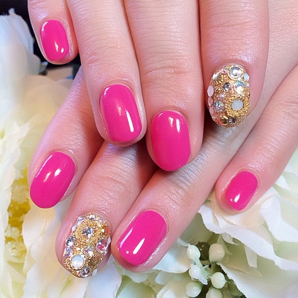ゴールドスタッズやパールの中に、赤のストーンを1つ入れるのもアクセントになっていいですね♡
