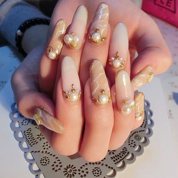 ストーンやパールを敷き詰めた指がキラキラして、夏にぴったりな指先にしてくれます♪