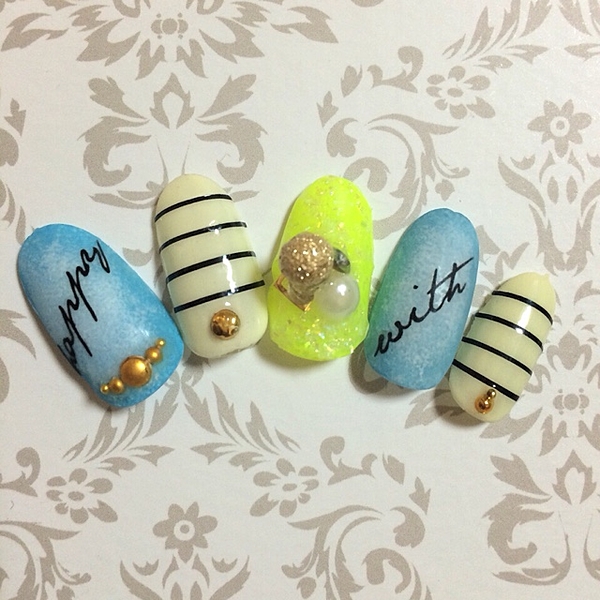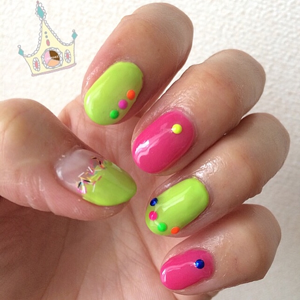 フレンチネイルっぽいデザインにビタミンカラーのマニュキュアなので、健康的に見えますよね。