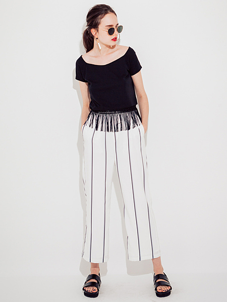 裾にフリンジの付いた今季らしいトップス。大きく開いたデコルテ部分がフェミニンなコーディネートに合います。動く度にゆらりと揺れるフリンジがクールでシーズンムードを高めます。シンプルにまとめたデザインであらゆるスタイリングに合わせられます!