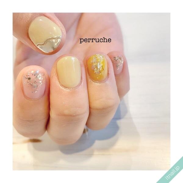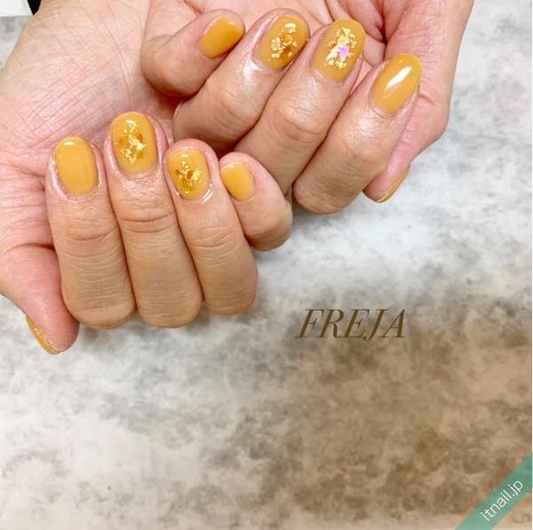 例えば、マスタードイエローでカラーリングしたネイルにゴールドラメをあしらい、その上にシェルを重ねるデザインはいかがでしょうか。ラメのメタリックな輝きとシェルの上品な輝きがマッチした、素敵なネイルを楽しめます。