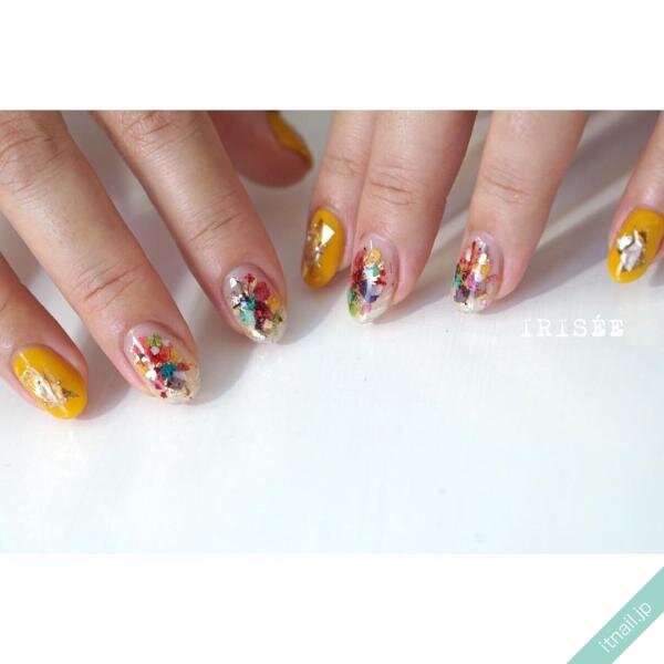 例えば、こっくりとした質感のマスタードイエローを使ってベースカラーを塗ったネイルの根元に、シェルを並べるデザインはいかがでしょうか。ホワイトやベージュといった主張しない色のシェルを基本としつつ、レッドやブルーといった色味のシェルをポイント使いするデザインもおすすめです♪