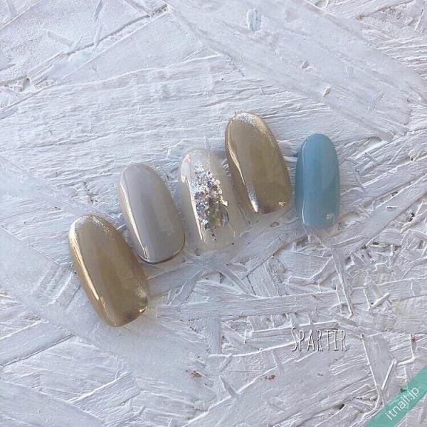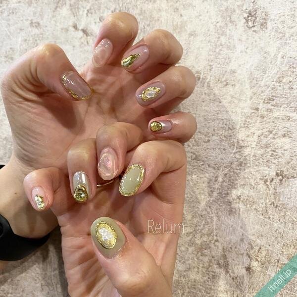 ほんのり自爪が透けるまろやかなカーキとシックなベージュのコーディネート。控えめだけどオシャレさが際立つハイセンスなデザインです。根本に置いたミラーアートでトレンド感もアップ。