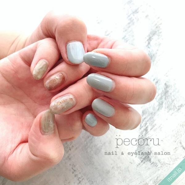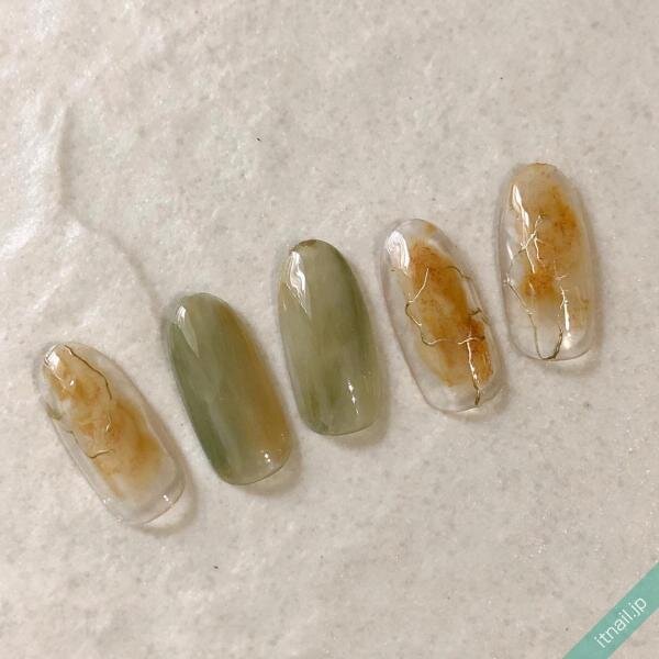 カーキといえば深みのあるグリーンですが、元は寒色系なので爽やかさも兼ね備えています。ミルキーなまろやかカーキで秋スタイルを軽やかに仕上げてみてはいかがでしょうか?アシンメトリーにしたニュアンスネイルもオシャレです。