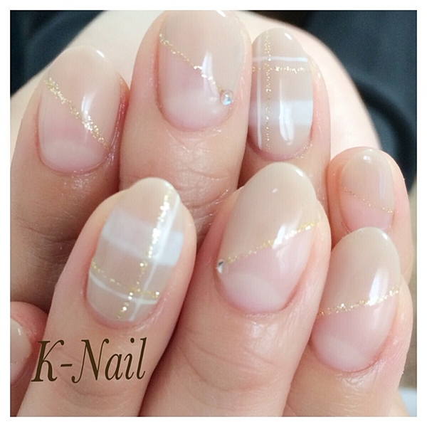 優しい雰囲気のネイルに、上品なゴールドのラメラインでアクセントをつけて!
