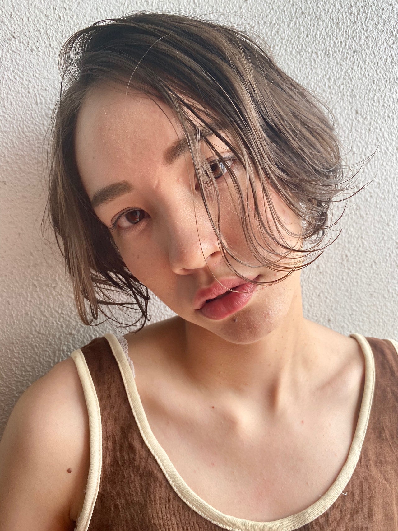 透明感のあるミルクティーベージュカラーがとってもおしゃれなショートボブには、長めのシースルーバングでほんのりアンニュイな雰囲気をプラスするのもおすすめですよ。