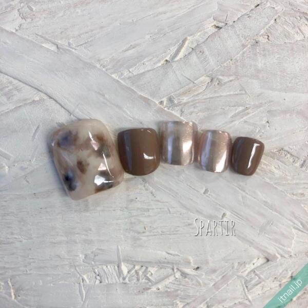 そんなべっ甲柄は、フットネイルに取り入れるのにもおすすめのデザインです。ちゅるんと艶やかなフットネイルは、足元全体と美しくみせてくれますよ♪また、この時期は夏の紫外線により足元の肌色がくすみがちになっている方も多いのですが、べっ甲柄をアートする際に使うブラウン系カラーには、肌色をキレイに見せる効果も期待できます。