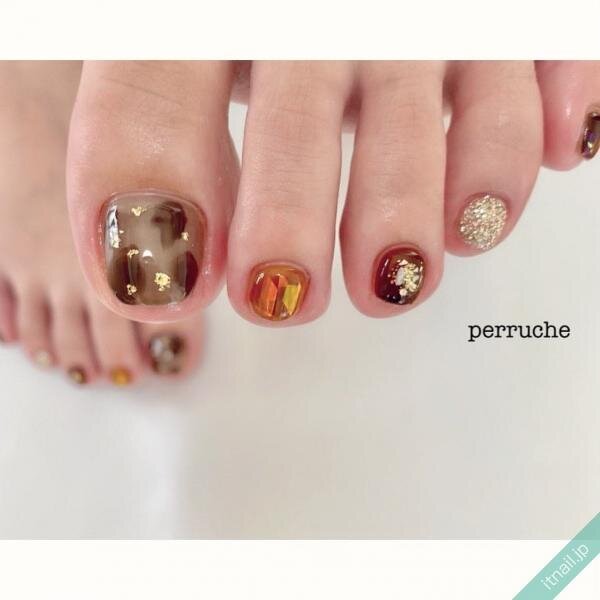 べっ甲柄フットネイルに金箔の輝きをプラスして