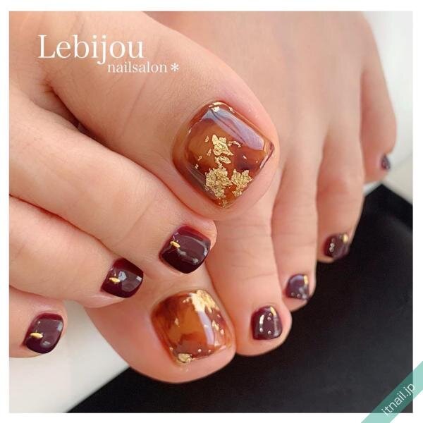 べっ甲柄のフットネイルは、金箔を使ったアレンジをプラスすることで、よりお洒落度の高いデザインに仕上げられます。