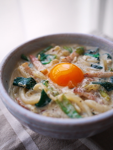 ホウレンソウとベーコンの豆乳カルボナーラうどん by J吉さん | レシピブログ - 料理ブログのレシピ満載!