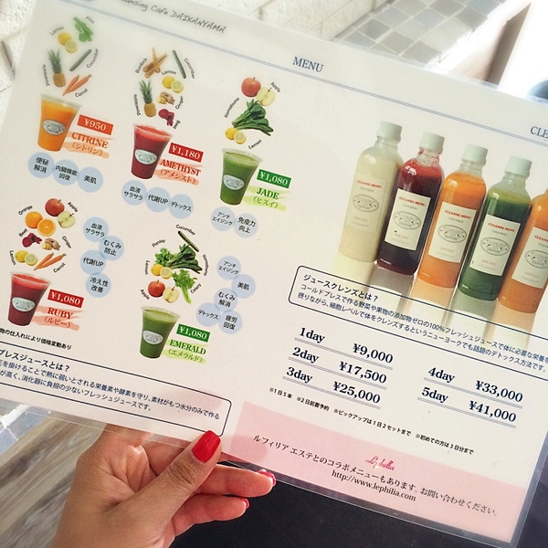 「クレンジングカフェ代官山」のコールドプレスジュース。