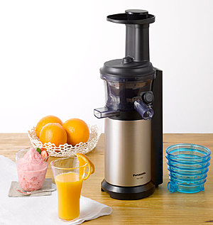 パナソニックのVITAMINESERVER低速ジューサーMJ-L500、低速回転で、ビタミンC豊富なフレッシュジュースを作る「低速圧縮絞り方式」を採用。フローズンスイーツもできて一台二役!