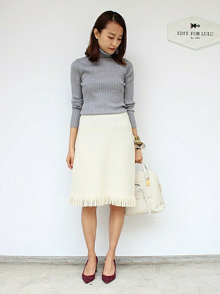 グレーのタートルニットと合わせて、スカートの柔らかさを強調したコーディネート。