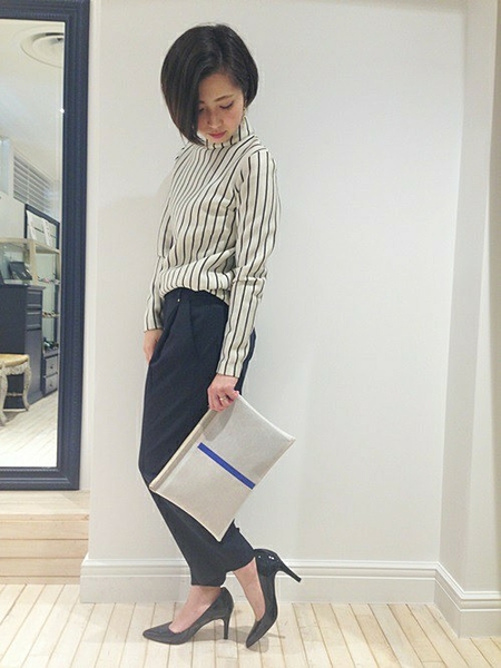 ストライプのトレンドトップスとクラッチバッグでクールに!
