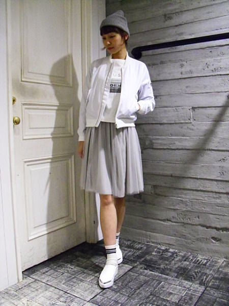 白のMA-1はまだ着ている人も少ないので一目引く存在にもなれちゃうこと間違いなし♪