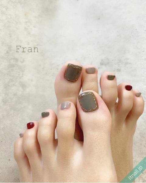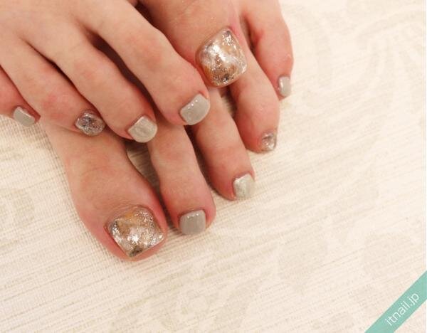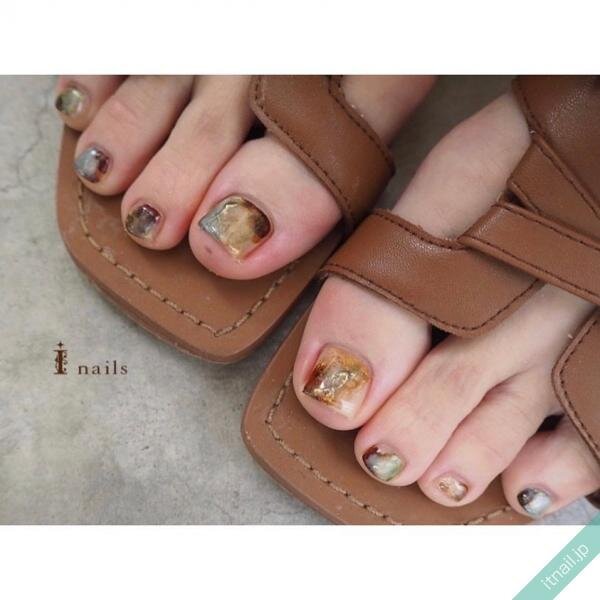 スモーキーネイルで秋のイメージを拡がらせたら、シェルやホイルの輝きでスタイリッシュに装飾。シックな配色も地味にみせない、魅力的なフットネイルが楽しめます。