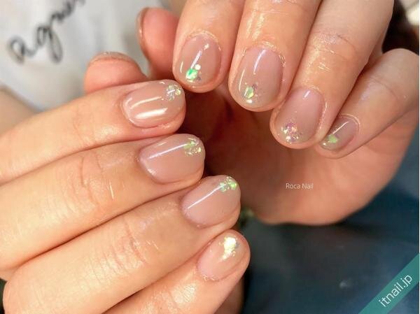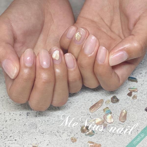 シンプルなクリアネイルに、存在感のあるシェルパーツがきらり。こなれた雰囲気がオシャレ度を格上げしてくれます。淡いパール感も上品。