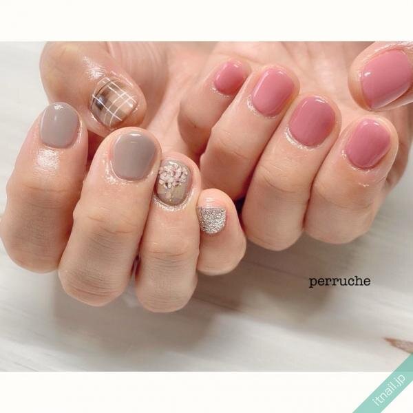 グレージュとピンクのアシンメトリーネイルは、派手すぎず地味すぎない、絶妙なバランスがオシャレ。チェックや押し花アートなど、さりげなく取り入れたデザインも効いています。
