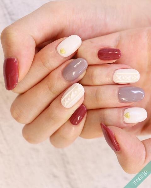 ぷっくり感が可愛いニットネイルは、あえて明るめボルドーと合わせるのがこの季節流。大人っぽく仕上がりやすいボルドー×ニットネイルは真冬までとっておくのが賢いかも。
