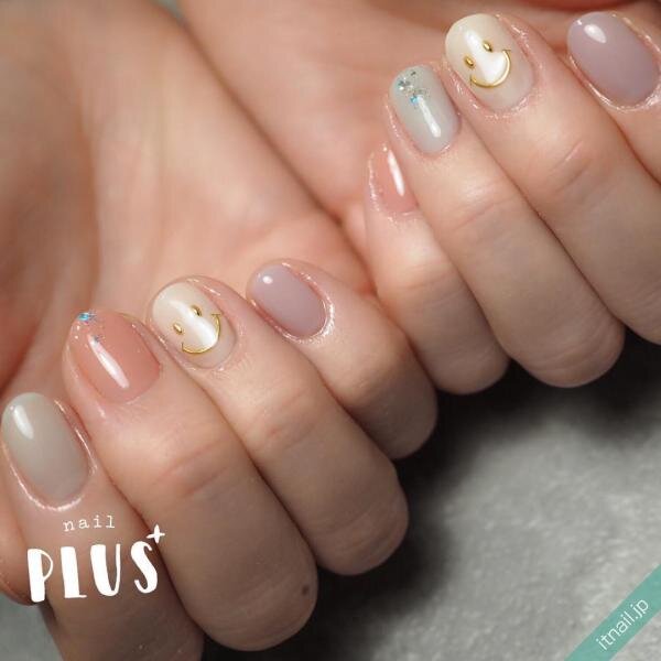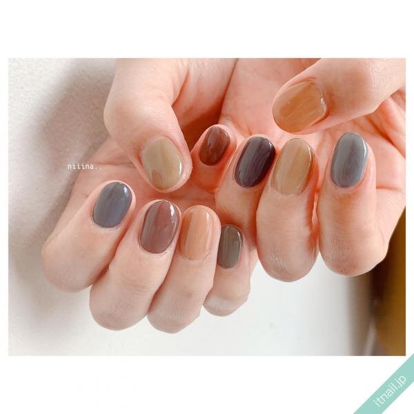 シックな配色のスモーキーネイルはこっくりとした深みカラーで引き締めるのもGOOD。ショートネイルのコロンとした雰囲気ともマッチしています。