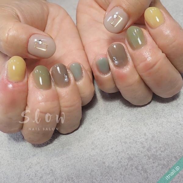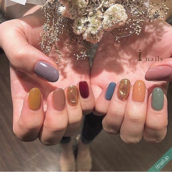 今年も注目度の高いアースカラーは、スモーキーな配色で秋らしさを漂わせて。渋みのあるカラフルネイルで指先が垢抜けます。イエローが爽やかさもプラスしてオシャレですね。