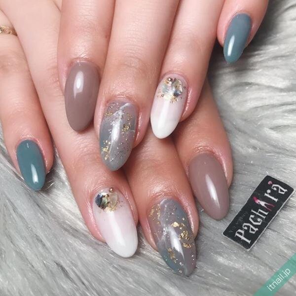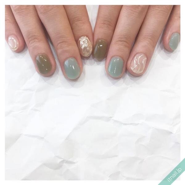 ひとつひとつのカラーに味があって、じっと眺めても飽きがこないスモーキーなカラフルネイル。全部の指が異なるカラーですが、左右とも薬指のみゴールドの立体アートにすることで統一感が演出されています。