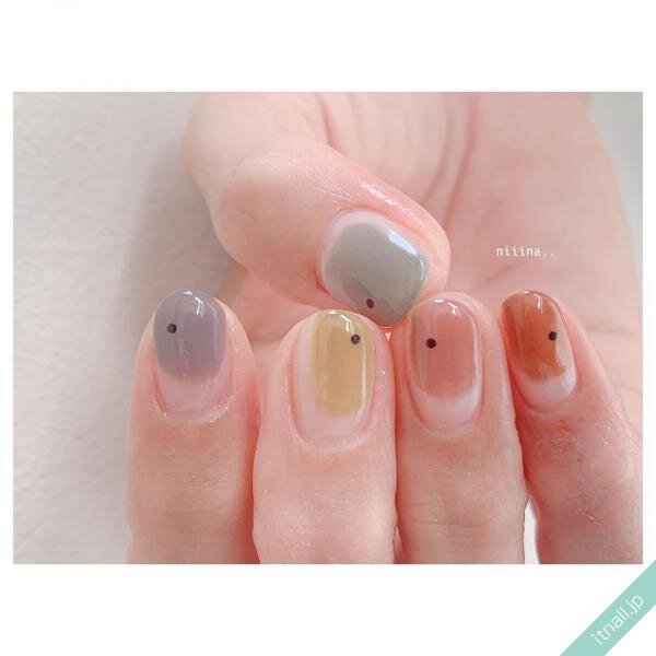 透け感のあるシアーなスモーキーカラーでまとめたカラフルネイル。淡く優しい発色は儚さを感じさせて、女性らしい華奢な印象を引き立ててくれます。