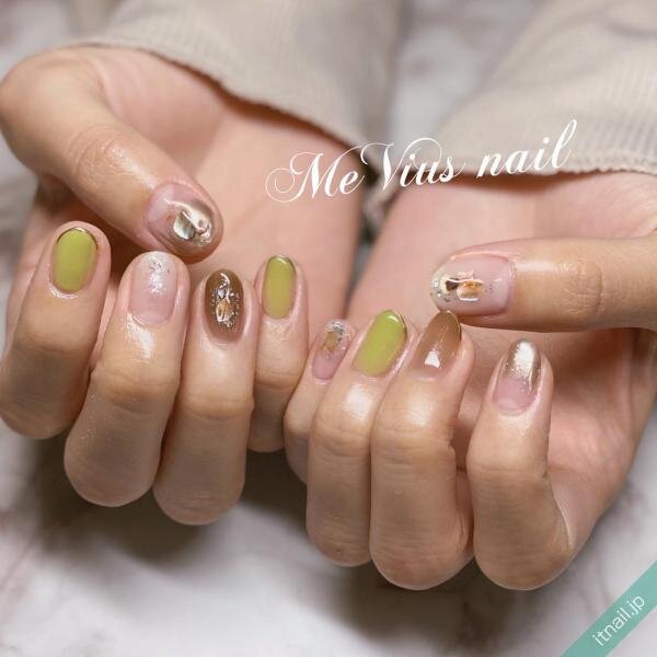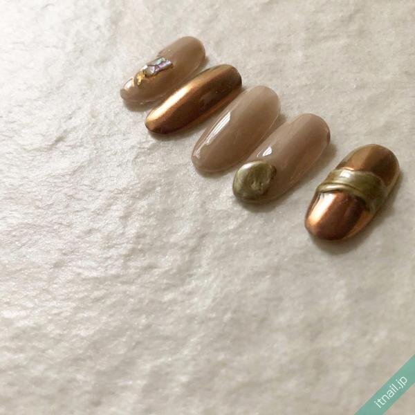 マロンカラーで作る天然石風デザインは、シックなまとまりで大人スタイリッシュです。色味が落ち着いている分、シェルの輝きで華やかさを添えて。こなれたスタイルを手に入れましょう。