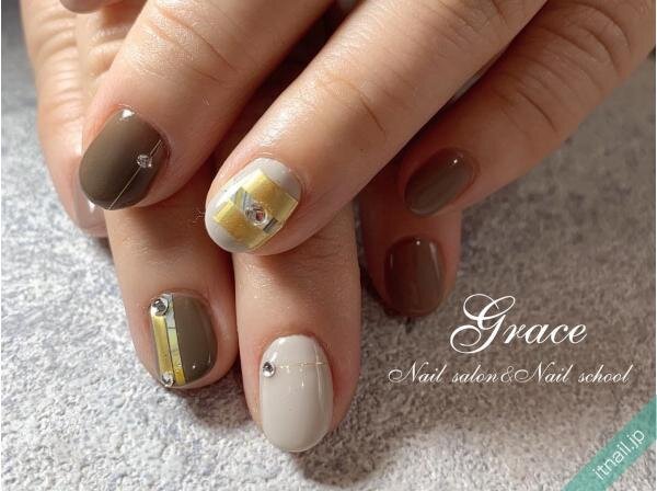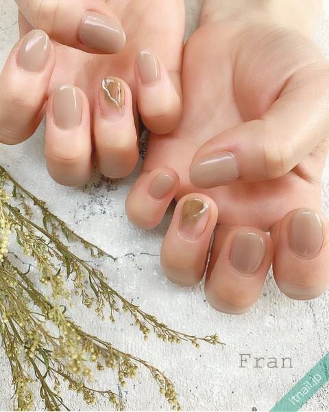 淡いトーンのマロンカラーでナチュラルな雰囲気のネイル。ヌーディな色味にマイルドなエッセンスが加わった上品なデザインです。ポイントアートはさりげない斜めフレンチでオシャレに。