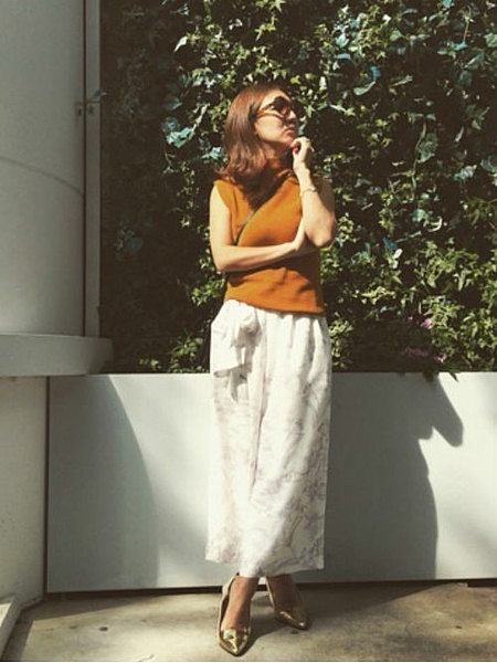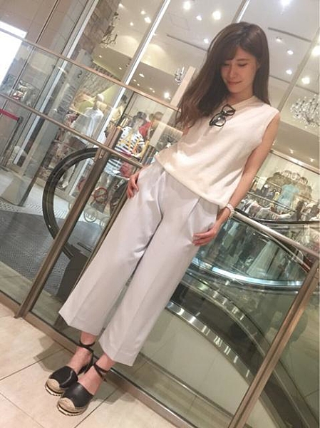 ノースリーブニットにガウチョパンツを合わせた、シンプルなコーディネート。