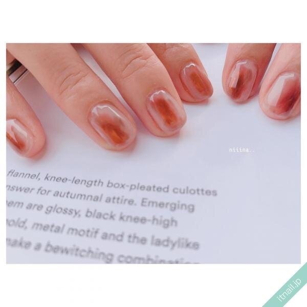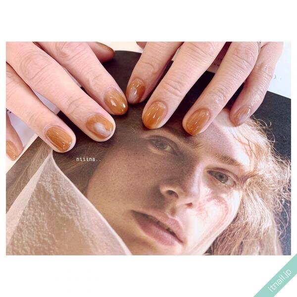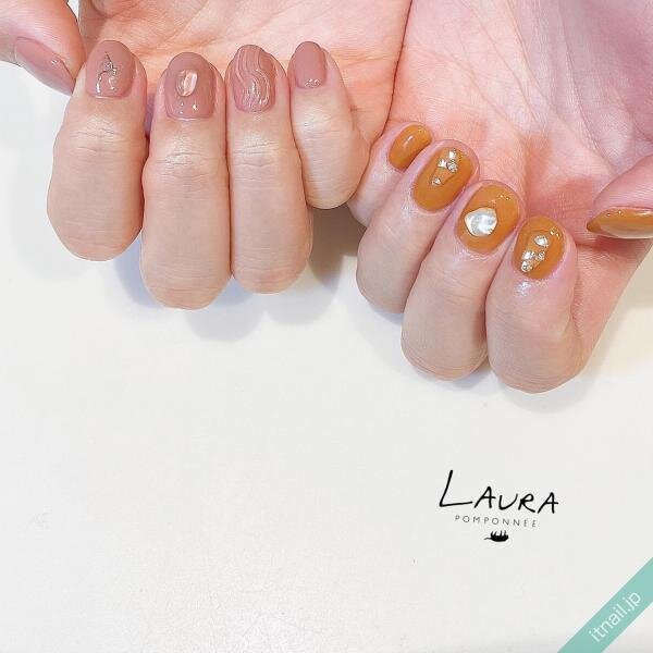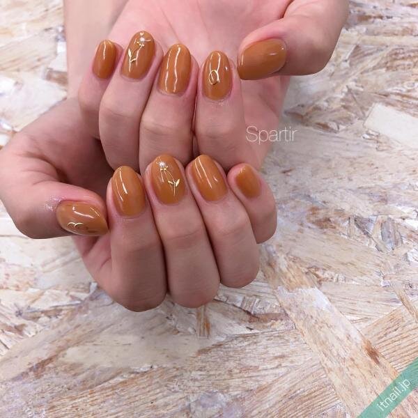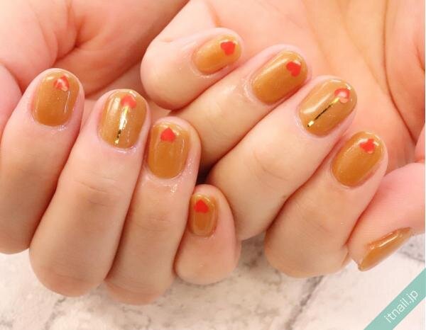 落ち着いた印象に転びがちなキャメルも、やっぱり可愛めに楽しみたい!という方はハートのホログラムを使ってみて。オレンジのハートはキャメルと相性がよく存在感もばっちりです♡各手に一本だけ引いたゴールドのラインがハートの矢のようで可愛い。