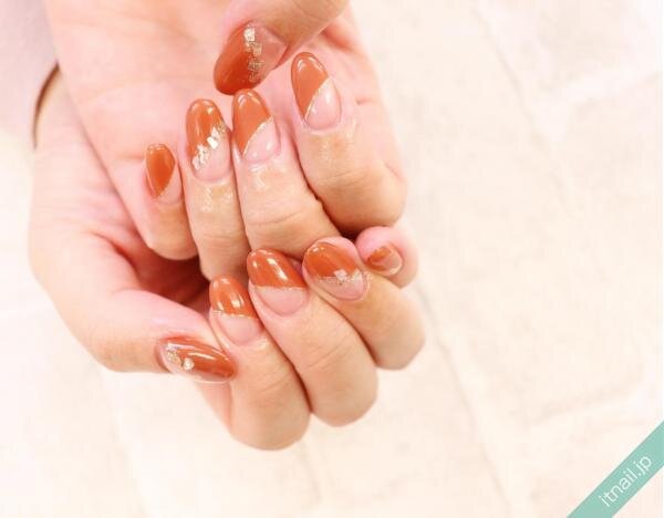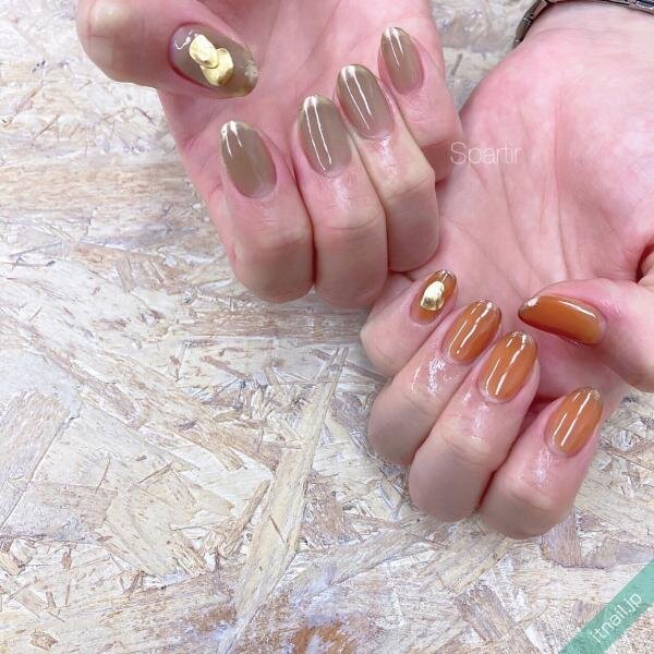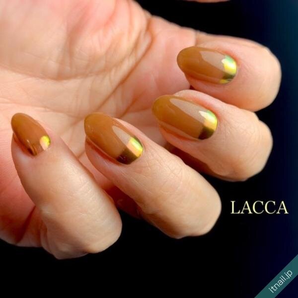 根元にきらんっとミラーを入れてバイカラーネイルに。つやたっぷりのキャメルとミラーの輝きで、アクセサリーがなくても十分なほどの華やかさです。爪はやや長めに細長くすると手元がより綺麗に見えますよ。