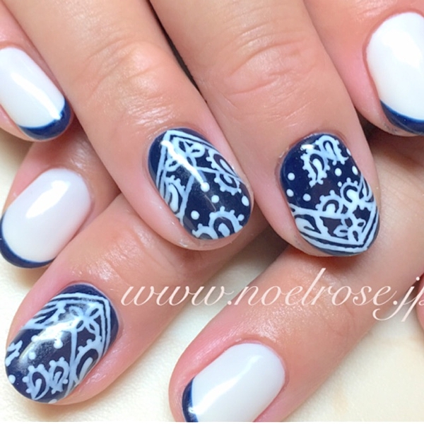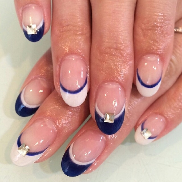 ブルーの細フレンチに、薬指だけアートを加えて。