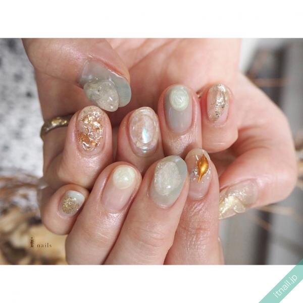 ぷっくりと乗せられた天然石のようなジェルとラメや薄いブルーグレーの色使いが、すごくキレイです。
