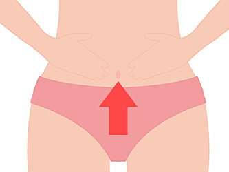 ③両手を使い下腹部の恥骨あたりから、おへその上まで押し上げます