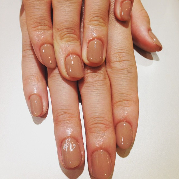 落ち着きあるトーンのオークルベージュを選べば、大人っぽく垢抜けた雰囲気を演出することができます。薬指にさりげなくつけたイニシャルがオシャレ度をうんと高めてくれますね。