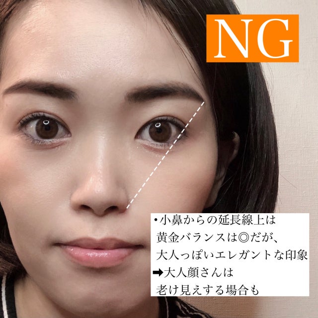 眉の長さが小鼻からの延長線上の場合、黄金バランスの比率には当てはまるのですが、口角からの延長線上と比べるとやや長め。