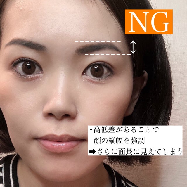 眉頭、眉尻と眉山の高低差があるほどに、顔の縦ラインを強調してしまいます。すると、さらに面長に見えてしまい、老け見えすることに。