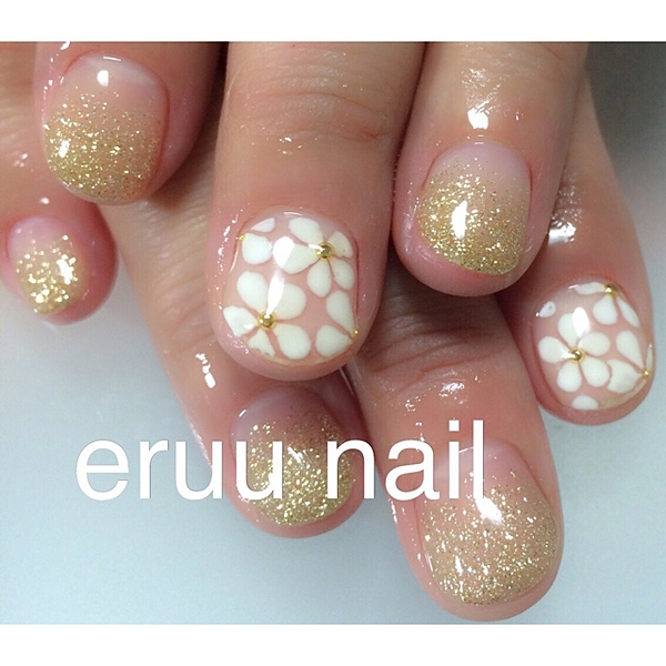 ホワイトのラメにホロが入ったラメグラデーション。涼しげなお爪にしたい時におすすめですよ。