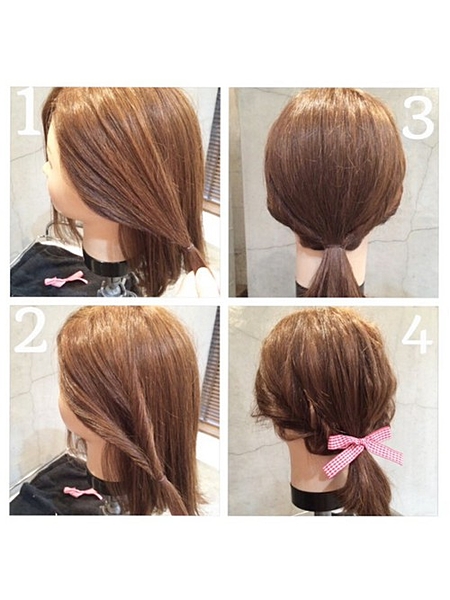 ④くるりんぱ。したところを引き出して、後頭部も少し引き出したて飾りをつけたら完成。