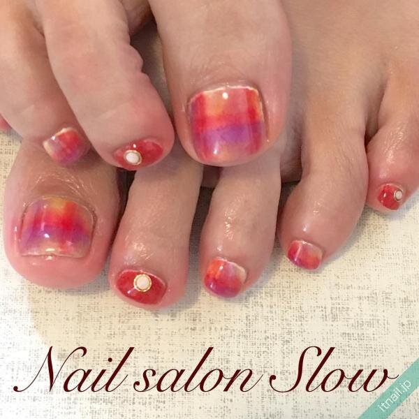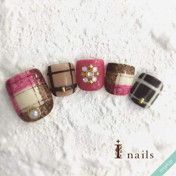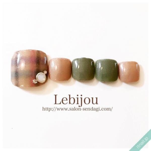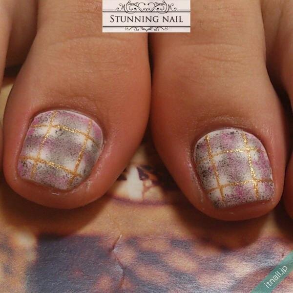 渋みのあるカーキがアクセントになったシックなフットネイルデザイン。毛布の質感そっくりな親指にはパープルやピンクも取り込んで、大人かわいい落ち着いたスタイルに仕上がっています。チェック柄は色が消えそうなくらいの淡いバランスがオシャレ。