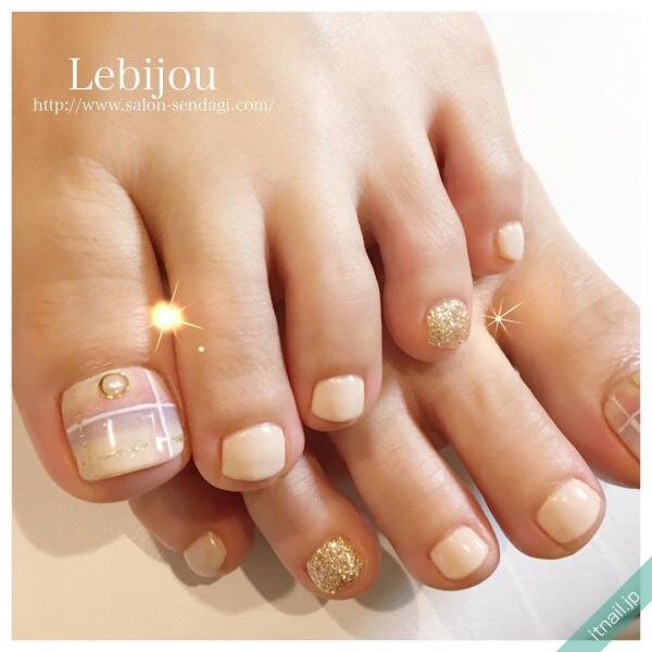ヌーディなホワイトベージュが上品なフットネイル。ふんわり優しい色味でブランケットアートを施して、さりげなく温もりが感じられる足先に。薬指にゴールドラメを差し込めばデザイン全体を引き締める効果も期待できます。