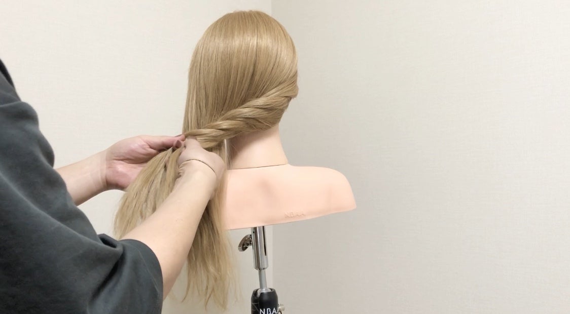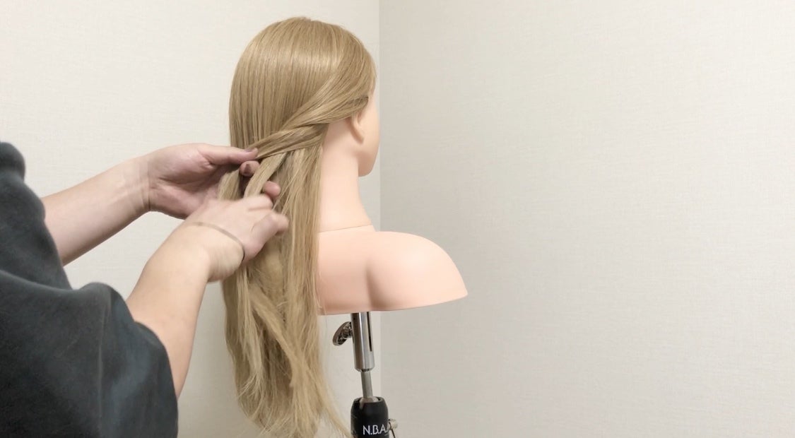 最後にゴムやピンで留めるのが難しくなってしまうので、はじめはなるべく少量の髪をすくって編み込みを始めるようにしてください。