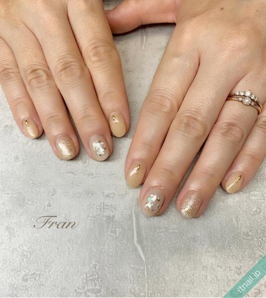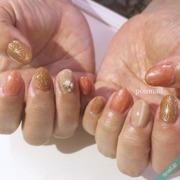 ベージュ、マスタード、オレンジ。あたたかみのある配色で作る麻の葉柄ネイル。細かい粒子がきらめくオレンジは、お祝いムードを高めてくれます。パールの装飾もエレガントですね。