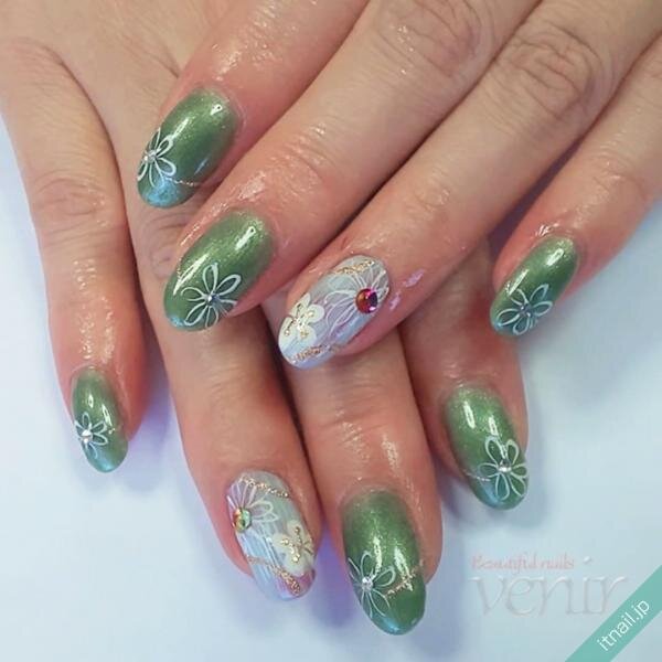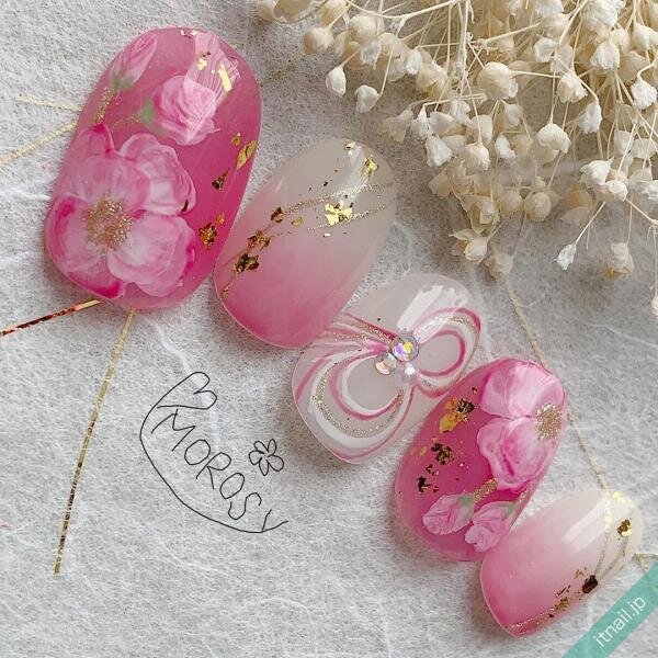 あたたかくフェミニンなピンクネイル。大胆な花柄がロマンチックな雰囲気を引き立てて、大人かわいい印象にまとまっています。水引デザインもオシャレにマッチしていますよね。