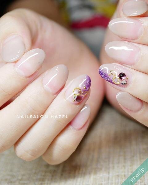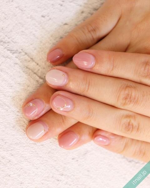 肌なじみの良いくすみピンクのネイルに、ゴールドで描く麻の葉模様。シンプルなポイントアートで施すのが上品です。落ち着いた雰囲気は、神聖な神社でもフィットしてくれますよ。