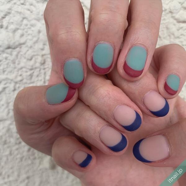 マット仕上げのフレンチネイルは、左右で配色やデザインを変えて、アシンメトリーな仕上がりにするのもおすすめです。