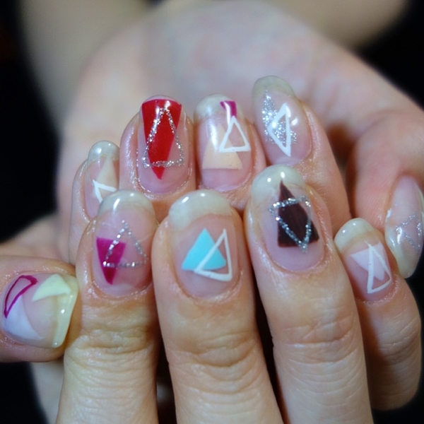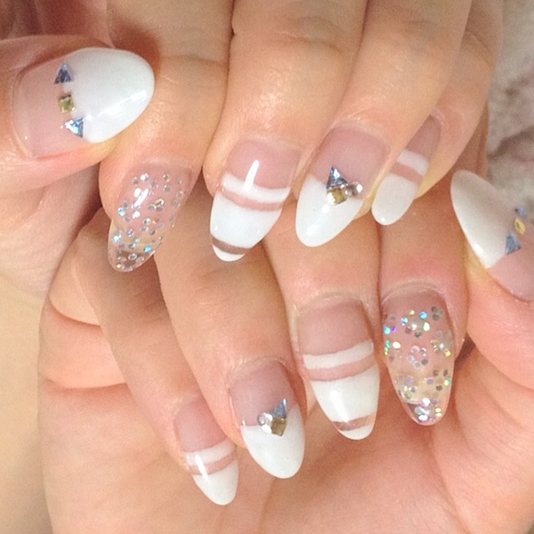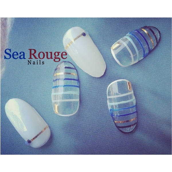 クリアベースにブルーのストライプや、くりぬきネイルにして透明感を演出・・♪