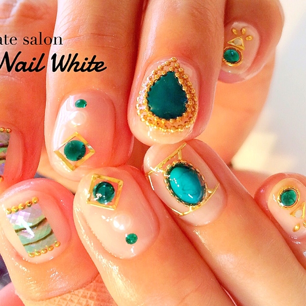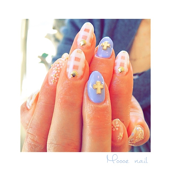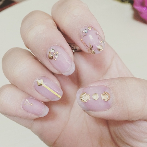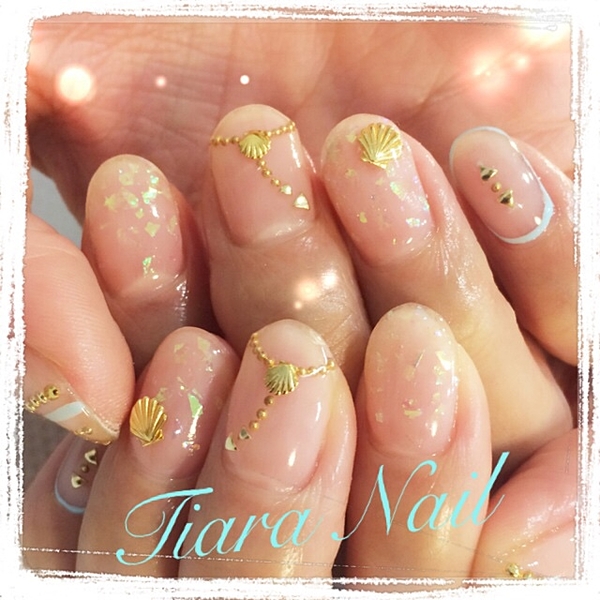 真ん中にゴールドシェルをのせて、夏にぴったりのネイルです