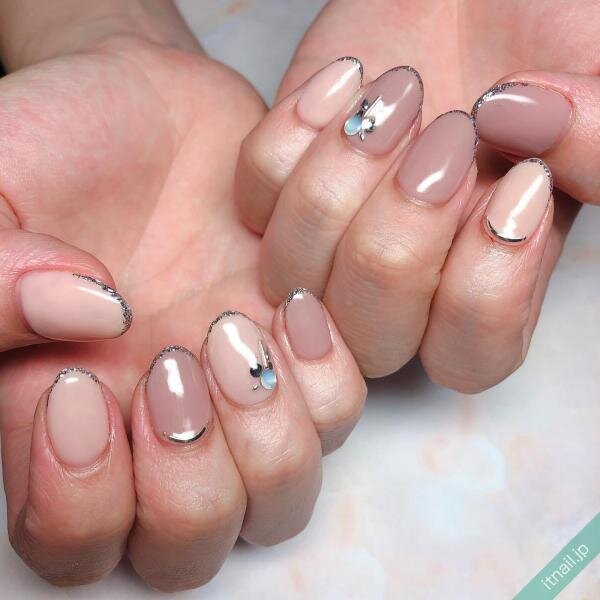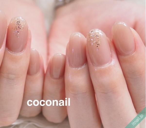 ヌーディなベージュは、パラパラとラメを散らすとエレガントな印象にまとまります。シンプルな美しさをキープするためにも、少しの量で効かせるのがポイント。光を受けて輝くから、少量でもしっかりと存在感が引き立ちます。